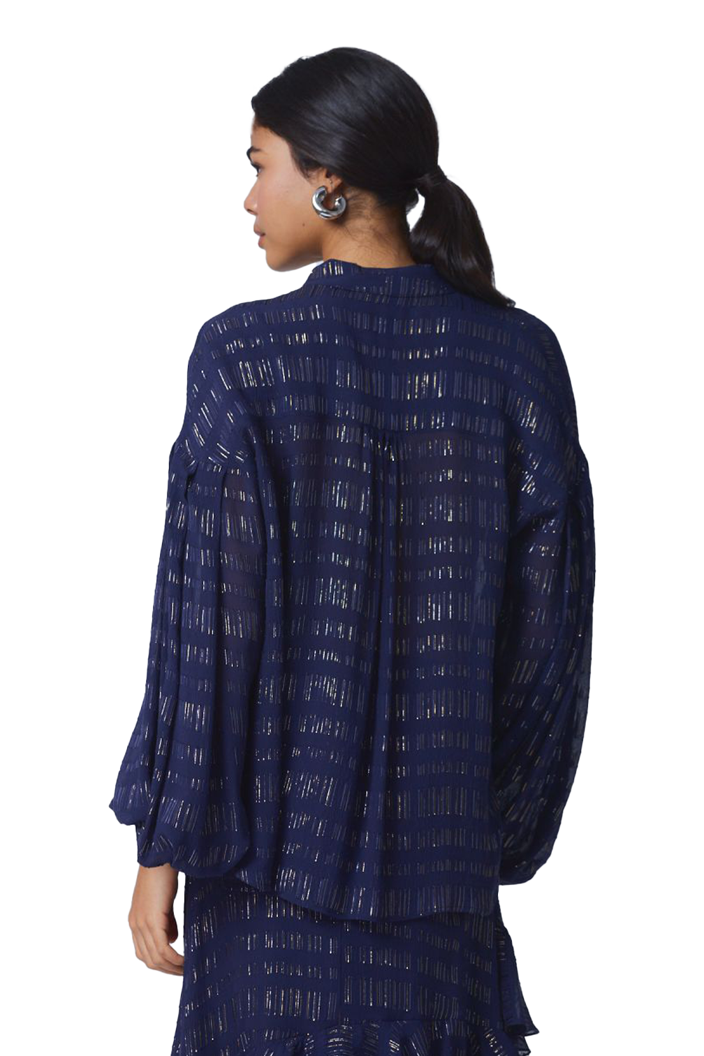 Long sleeve blouse in chiffon with lurex details, featuring puffy sleeves with pleats, V-neckline and tie at the neck.