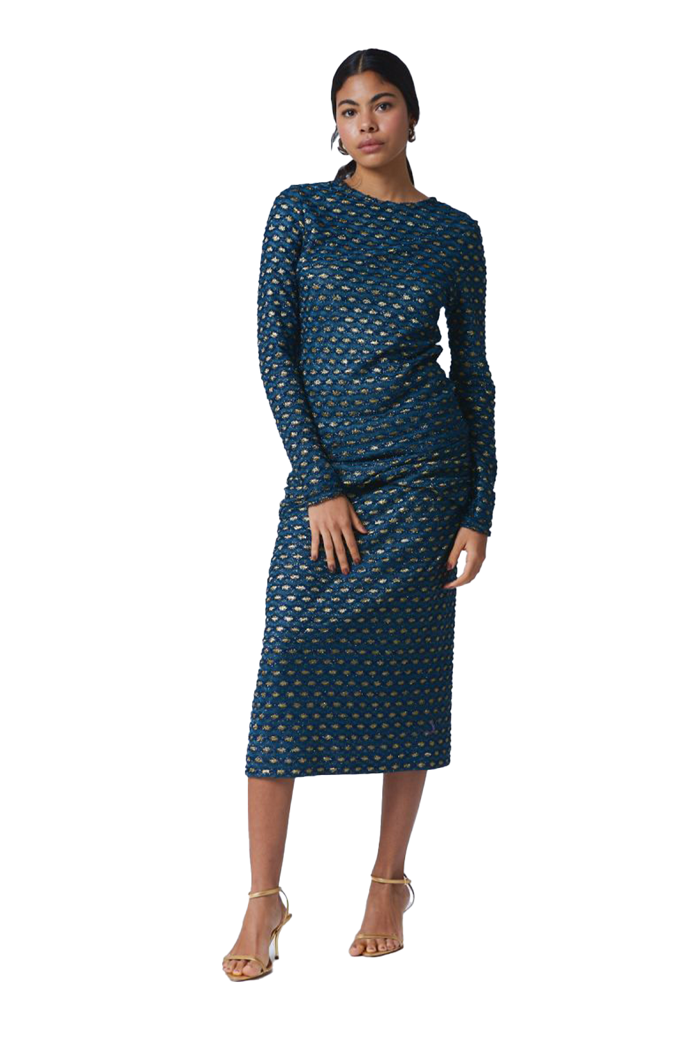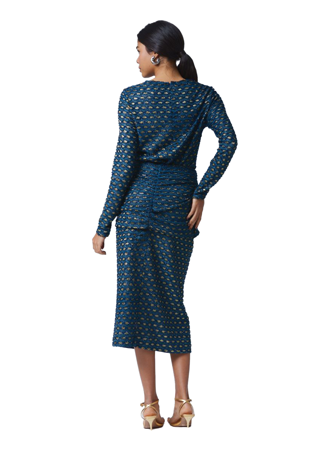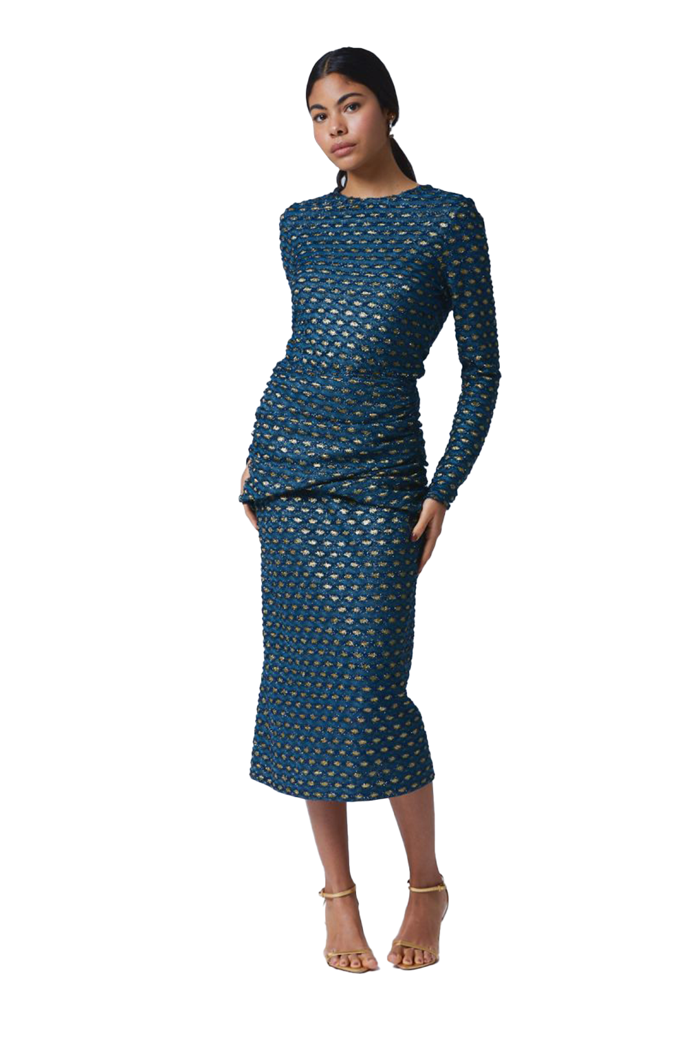 Long sleeve blouse in cutout knit with crew neckline and invisible zipper closure at center-back.
