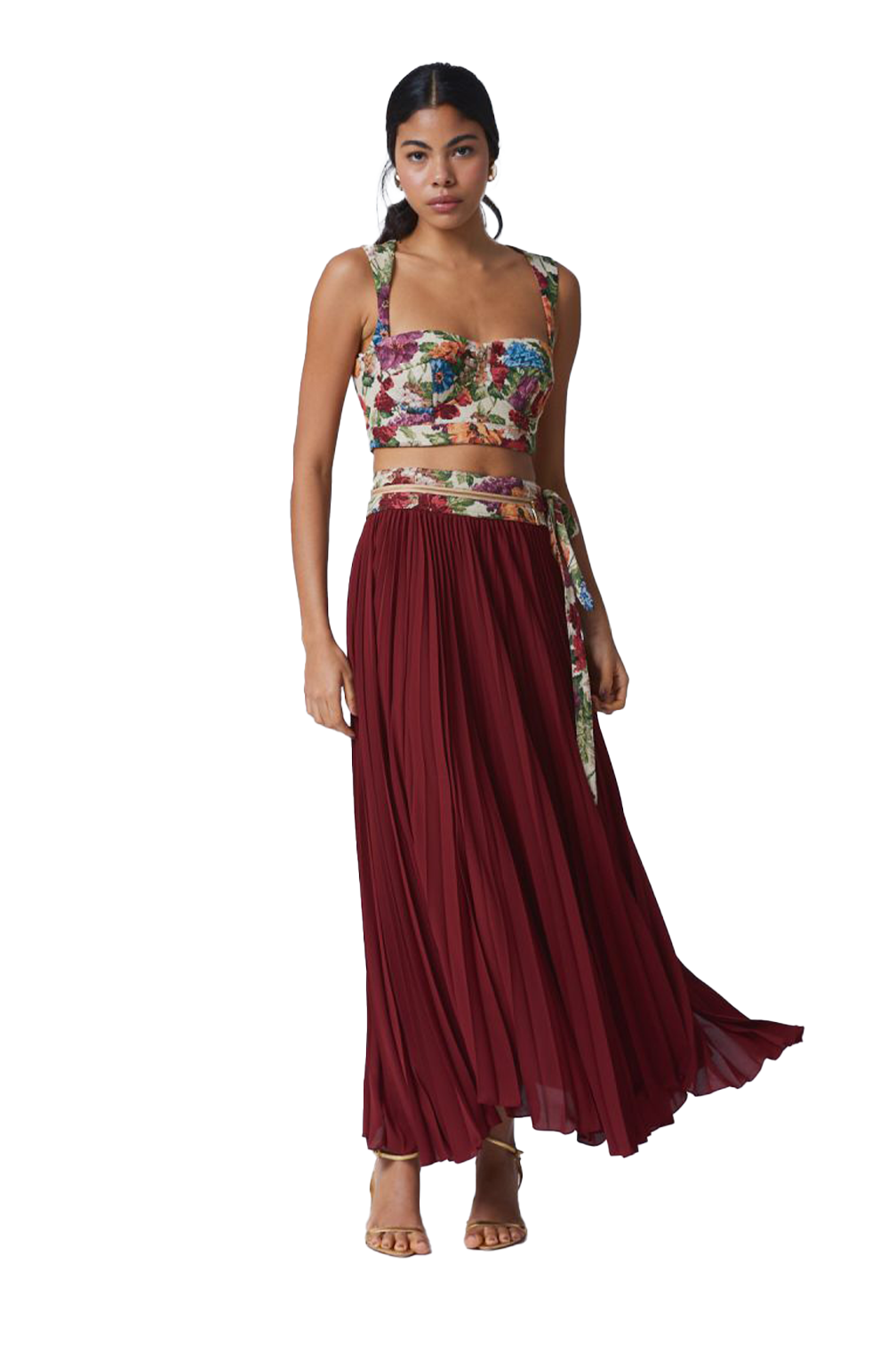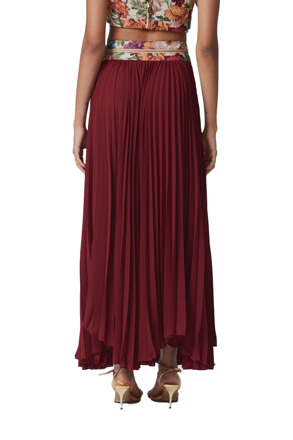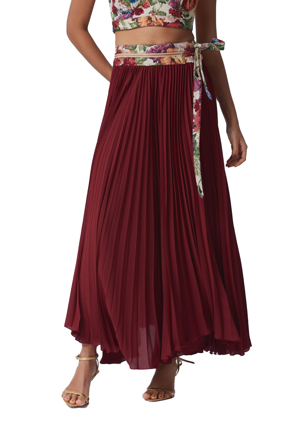 Pleated skirt in plain crepe with tapestry jacquard waistband featuring zipper detail and side tie.