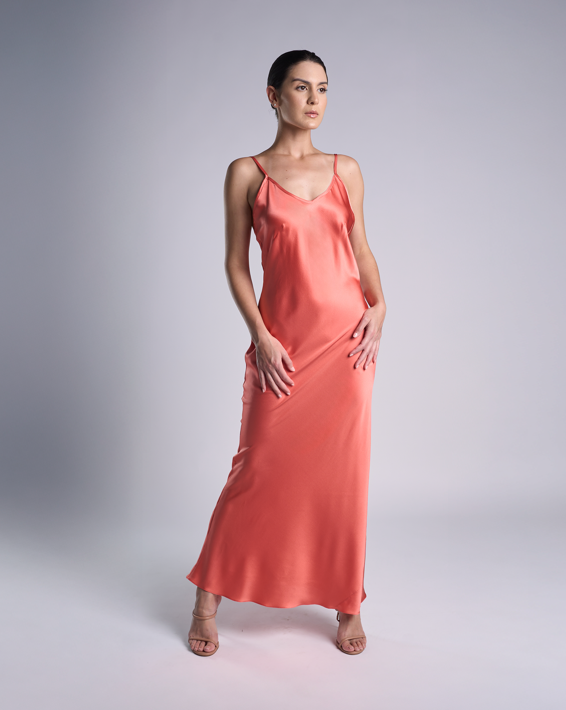 Minimalism meets pure elegance in the AMPM Slip, a timeless piece designed for both day and night. Made from 100% natural silk, this full-length slip dress drapes the body with an effortless, fluid silhouette and a luminous coral hue that evokes warmth and vitality.