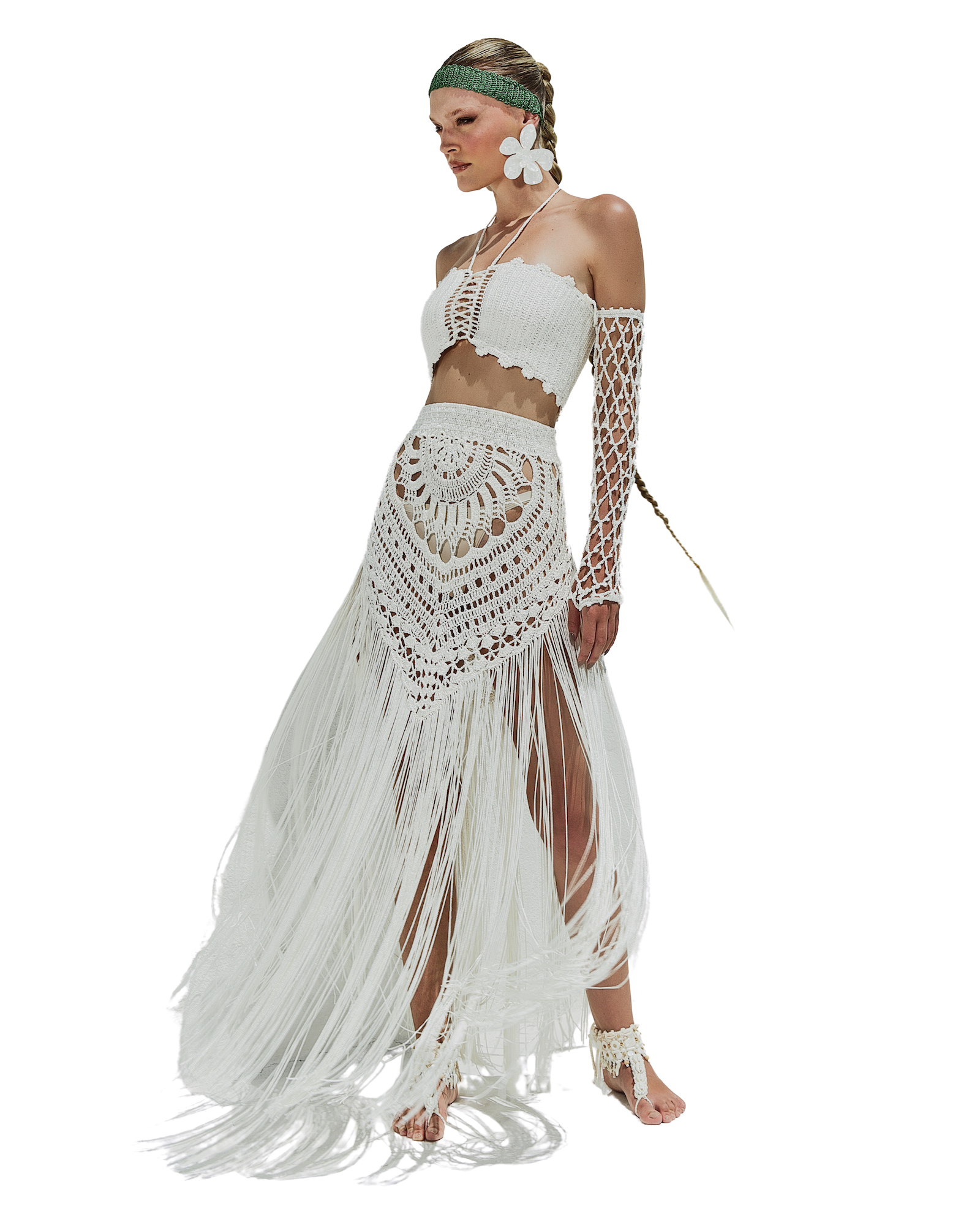 The Be Tulum Skirt enchants with the lightness of its flowing fringes placed manually in meticulously crafted work. It has elastic at the waist and a mandala on the hip, trademark of Ammi pieces, which gives it an unmistakable look. The Be Tulum Skirt does not include lining and should be worn with hot pants or underwear in the same color or nude. The mandala is a symbol of harmonization, capable of transforming the energy of both people and environments. We believe that through mandalas things can be processed and move forward to their degree of evolution.