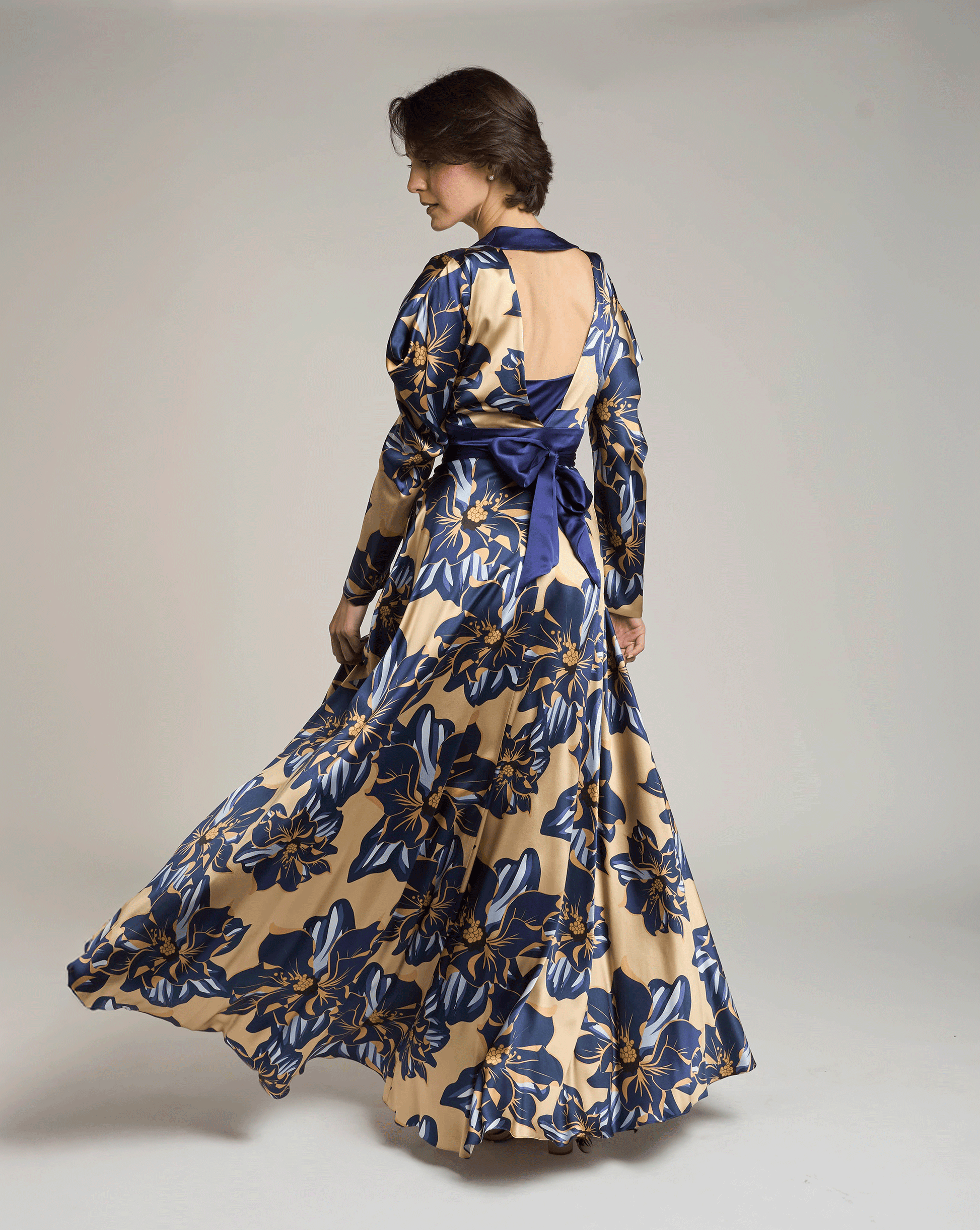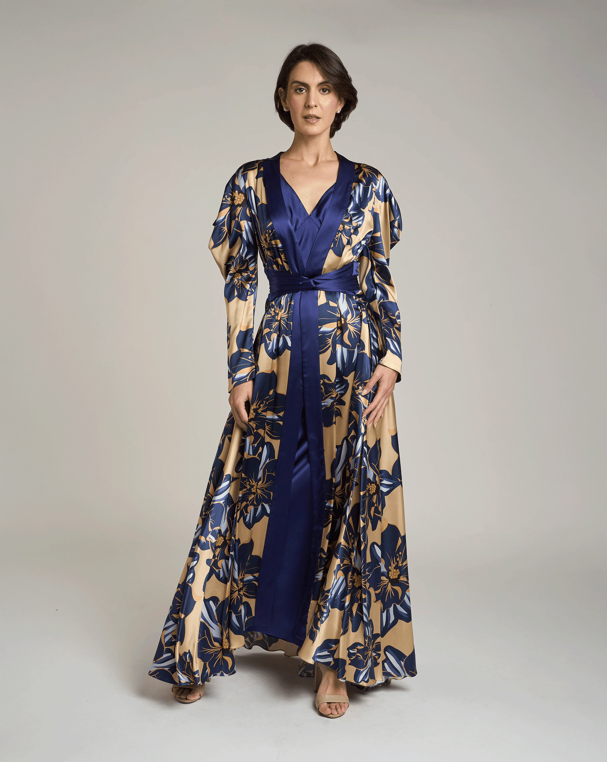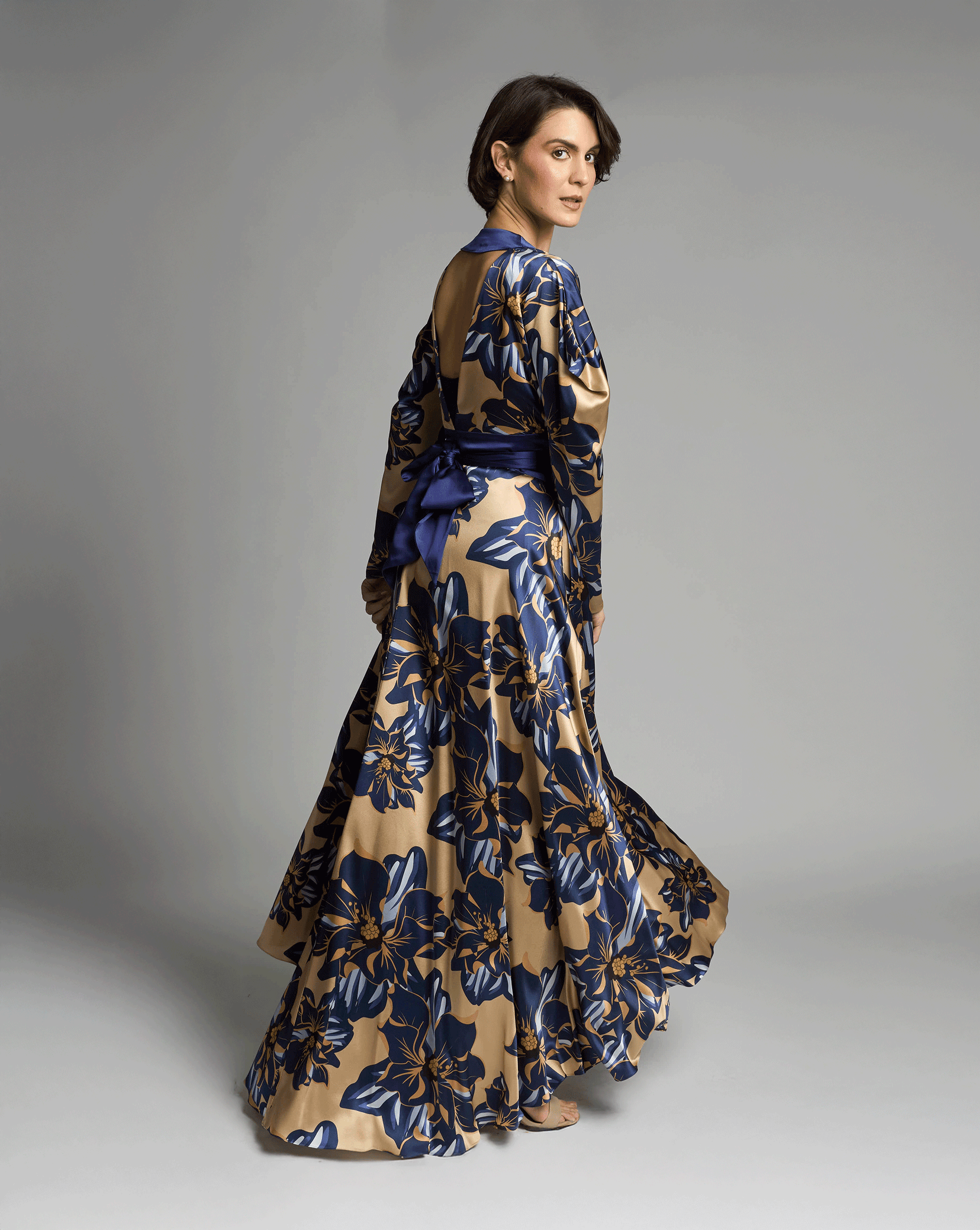Experience the lavish indulgence and timeless grace of the DREAM ROBE, meticulously handcrafted in the USA from luxurious 100% silk charmeuse. Adorned with a delicate larkspur print, this exquisite robe brings refined elegance to any wardrobe. Its seamless blend of beauty and comfort makes it the ultimate dream robe. The attached belt offers styling versatility, allowing it to be worn tied in the front or back. For a complete and indulgent ensemble, we recommend pairing it with the DREAM SLIP.