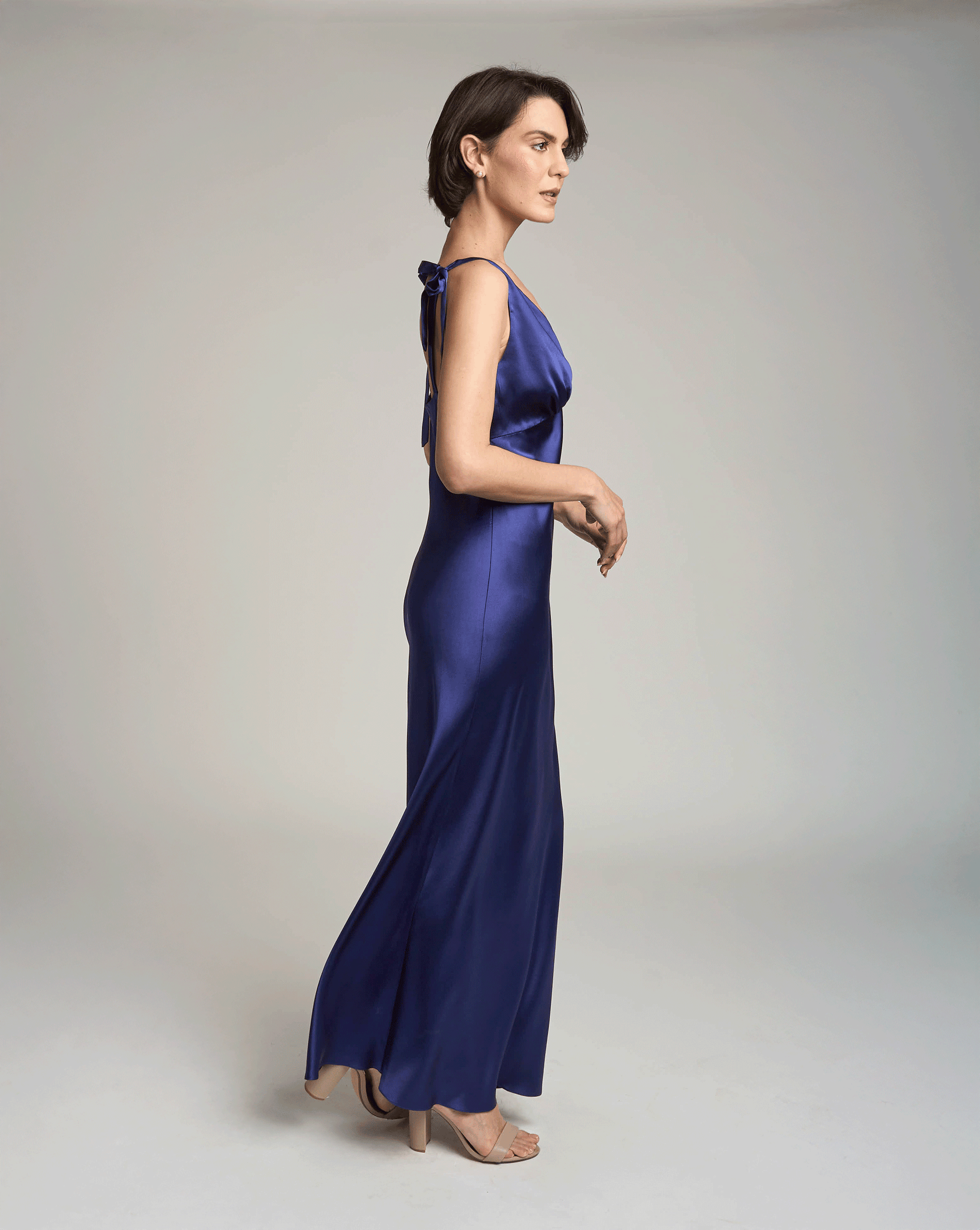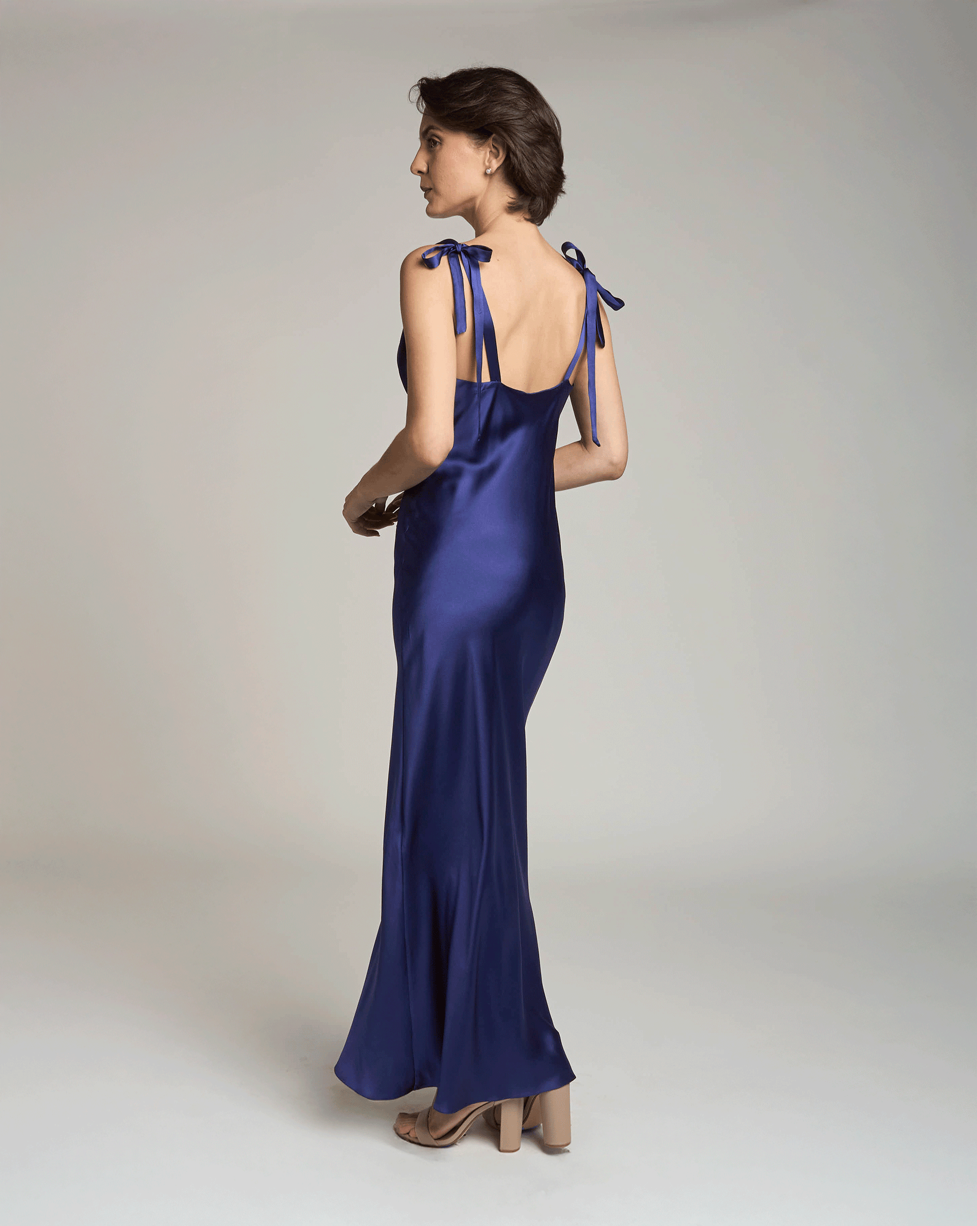 Experience the elegance of a moonlit night with the DREAM SLIP, a beautiful navy blue dress meticulously handcrafted in the USA from 100% silk.
