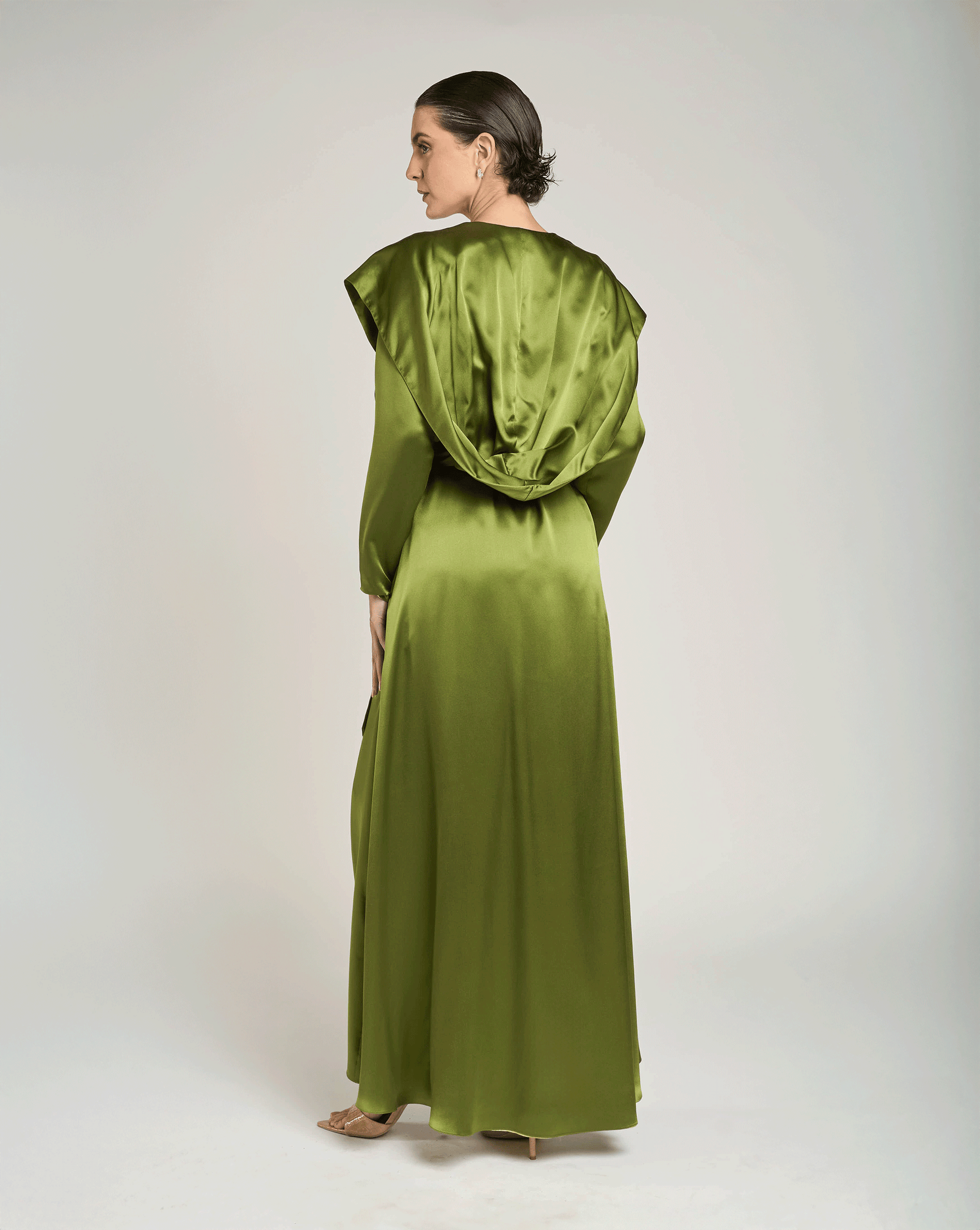 Its sleek design and versatile green hue make it a standout piece, bringing timeless elegance to any wardrobe. Perfect for any occasion, this refined robe pairs beautifully with the EVERGREEN SLIP for a complete and sophisticated ensemble.