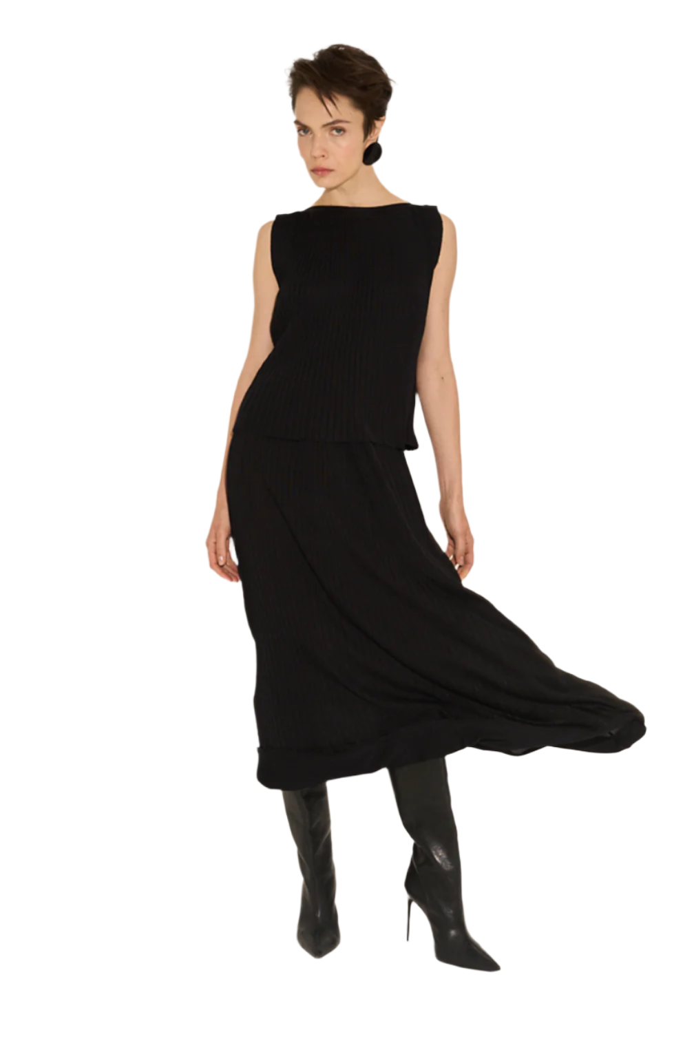 The Jhon Tank Top celebrates the power of simplicity with its luxurious ribbed texture and sculptural boat neckline. This sleeveless masterpiece, adorned with a statement belt, transforms the everyday into the extraordinary.