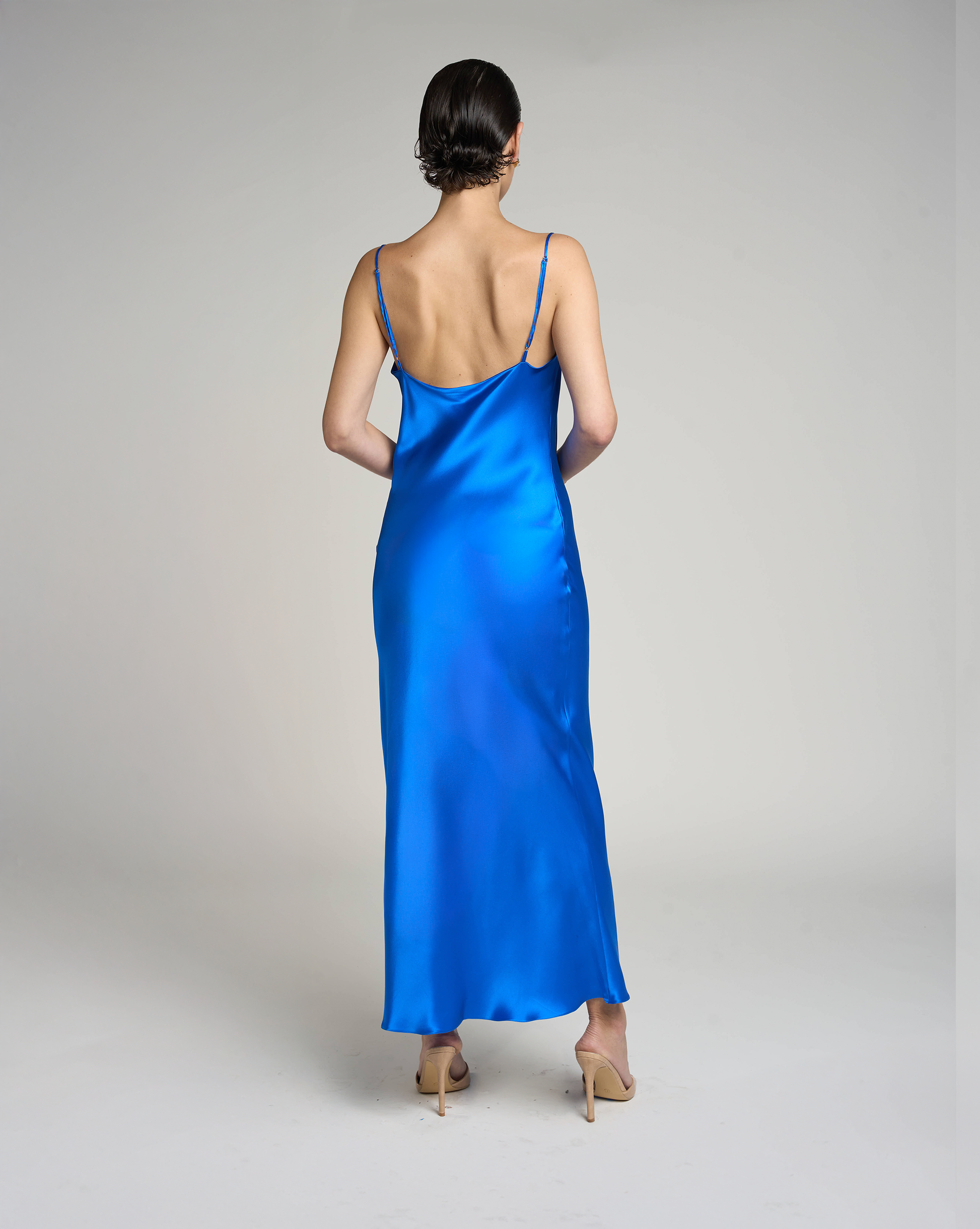 This midi-length bias slip dress is meticulously handcrafted in the USA from 100% silk charmeuse.