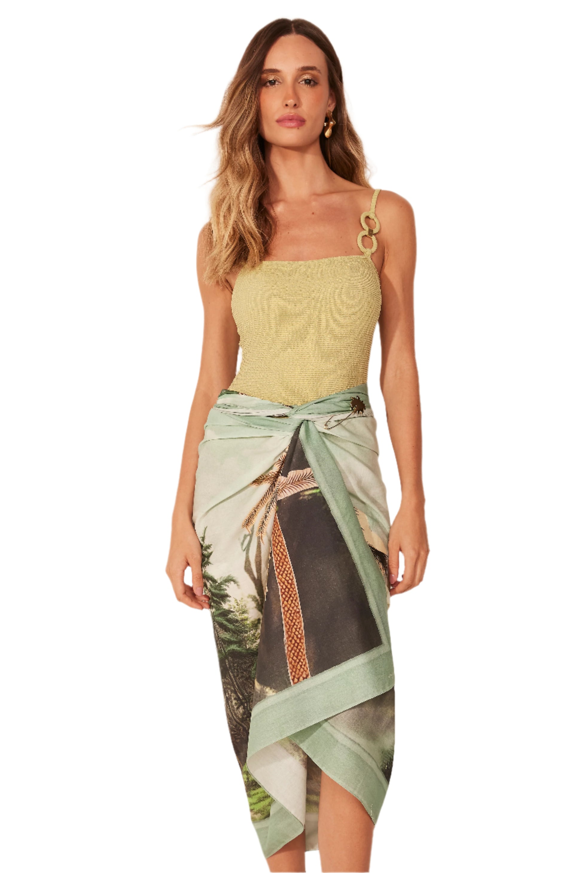 This luxurious sarong showcases an exquisite vintage botanical landscape print featuring romantic tropical oasis, styled here as an asymmetrical wrap skirt. From beach cover-up to sophisticated resort wear.