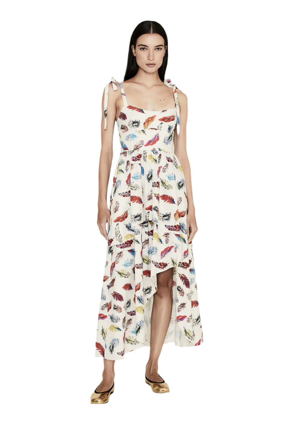 This playful midi dress features a vibrant feather print with adjustable tie shoulder straps and a striking asymmetrical hemline that's shorter in front and longer in back.