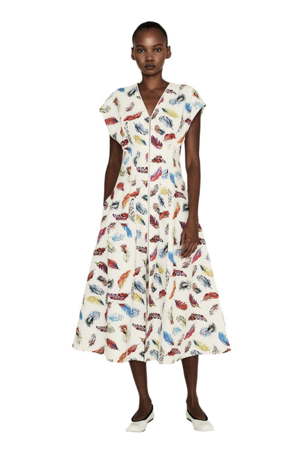 This charming midi dress showcases a vibrant scattered feather print in blues, reds, and yellows across a white background, featuring a flattering V-neckline, short sleeves, and a graceful pleated skirt with front zipper closure.