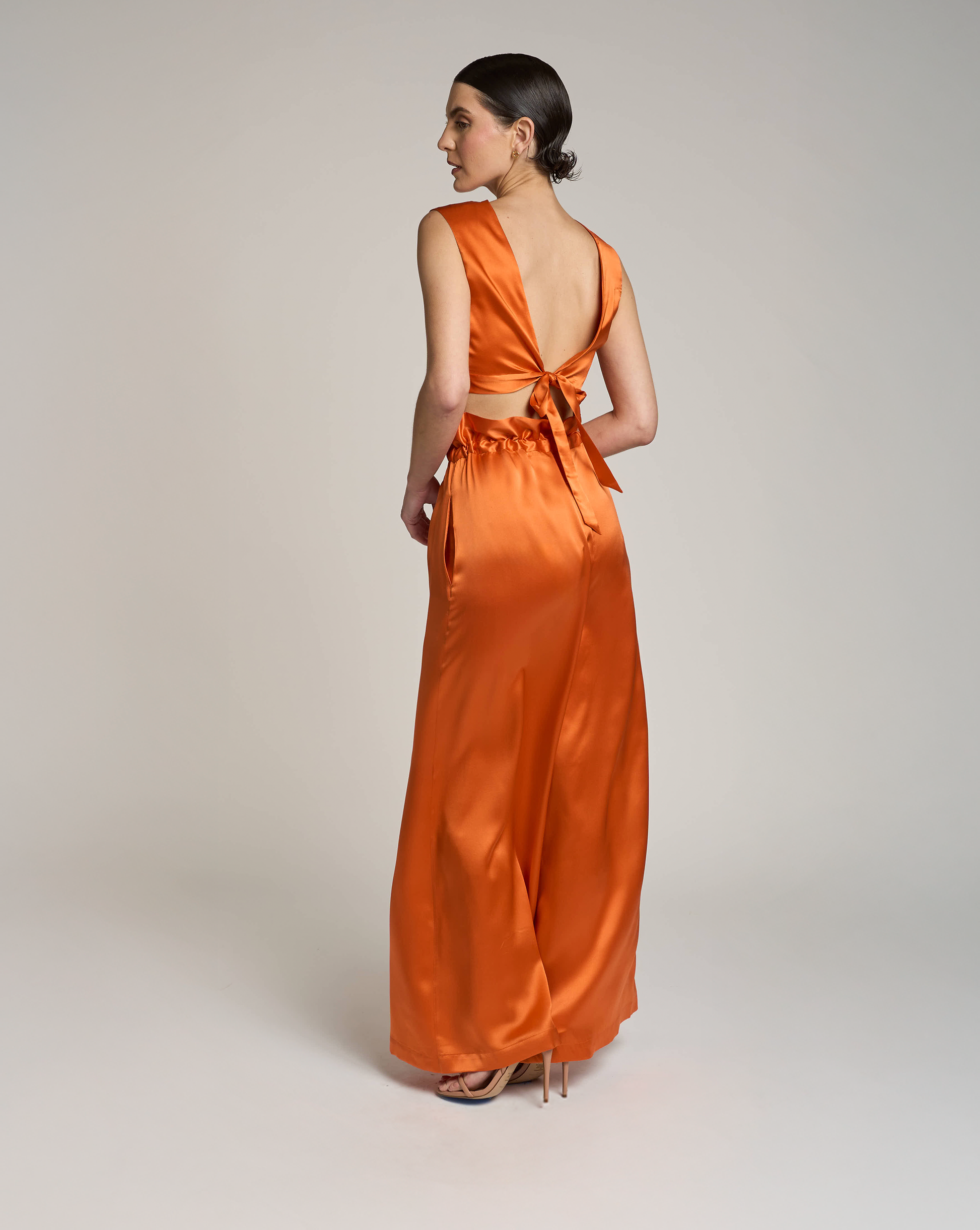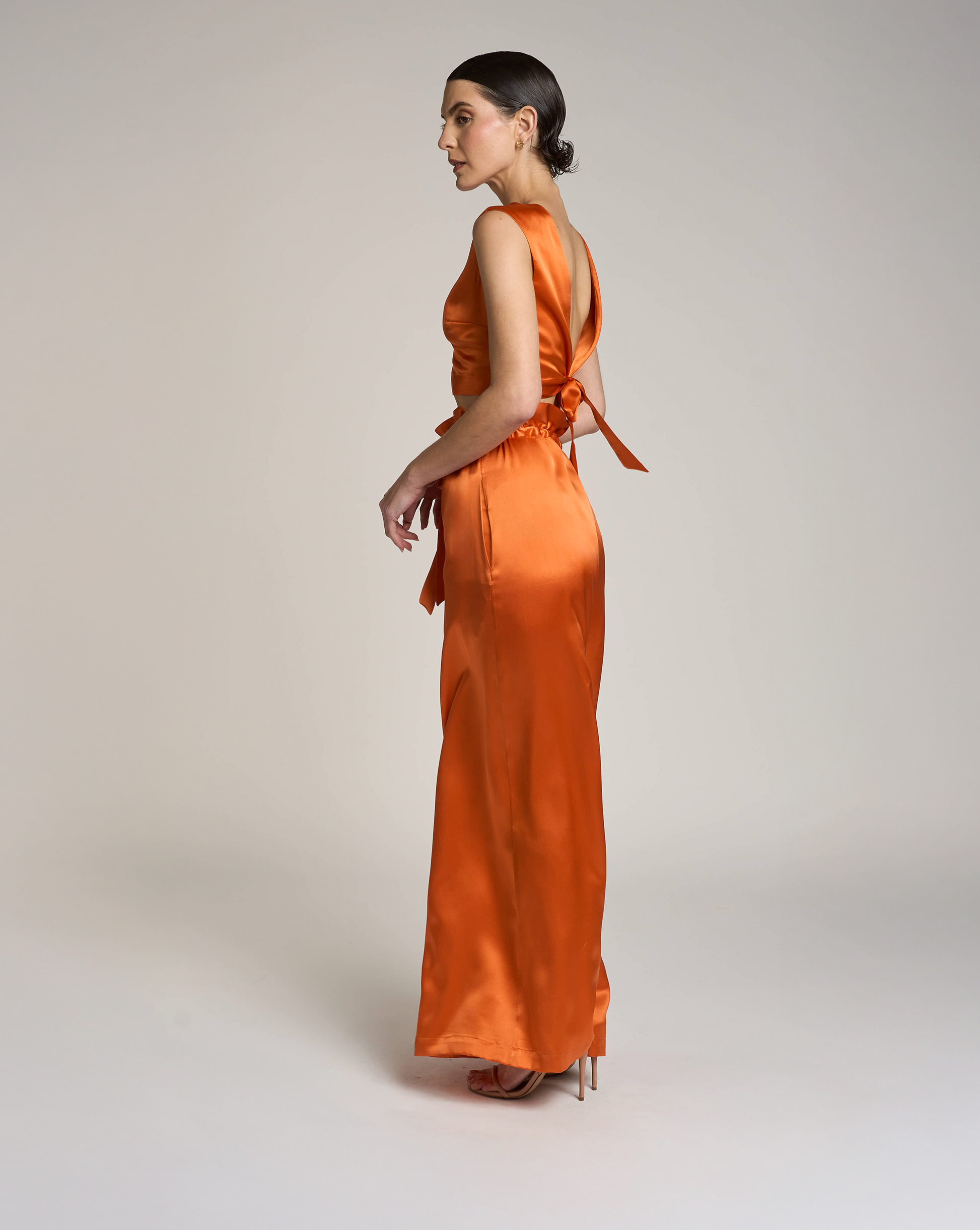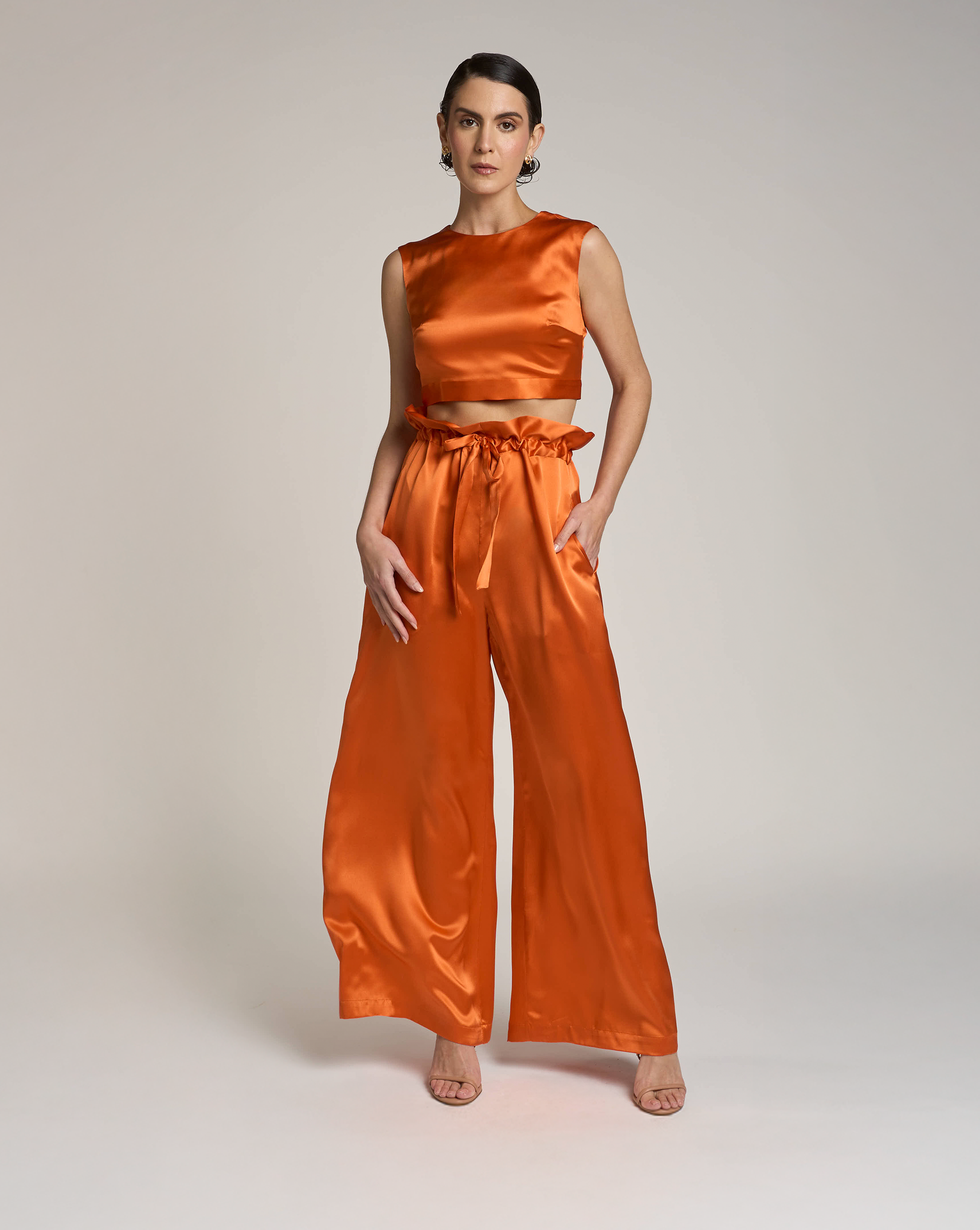 The sleeveless top features a straight neckline and a deep V-cut back, blending modern minimalism with timeless elegance. Paired with high-waisted palazzo pants and a matching silk belt, this look flatters the figure and moves with graceful energy — sophisticated, bold, and effortlessly luminous.